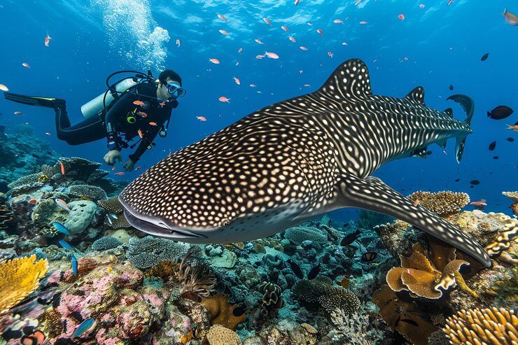 From shallow coral gardens filled with reef fish to deeper channels where large marine species gather, every dive site offers something different. Divers often encounter manta rays gliding effortlessly through the water, reef sharks navigating the currents, and in some regions, even the majestic whale shark.