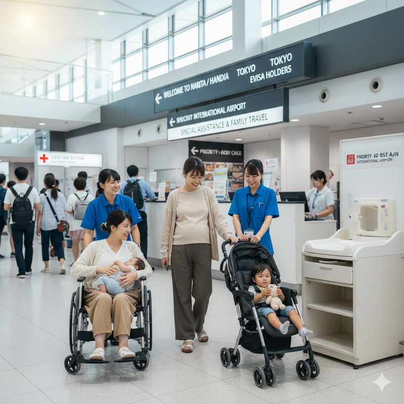 - The facilities enable pregnant women and children to travel through the airport when they travel to Japan using an eVisa.